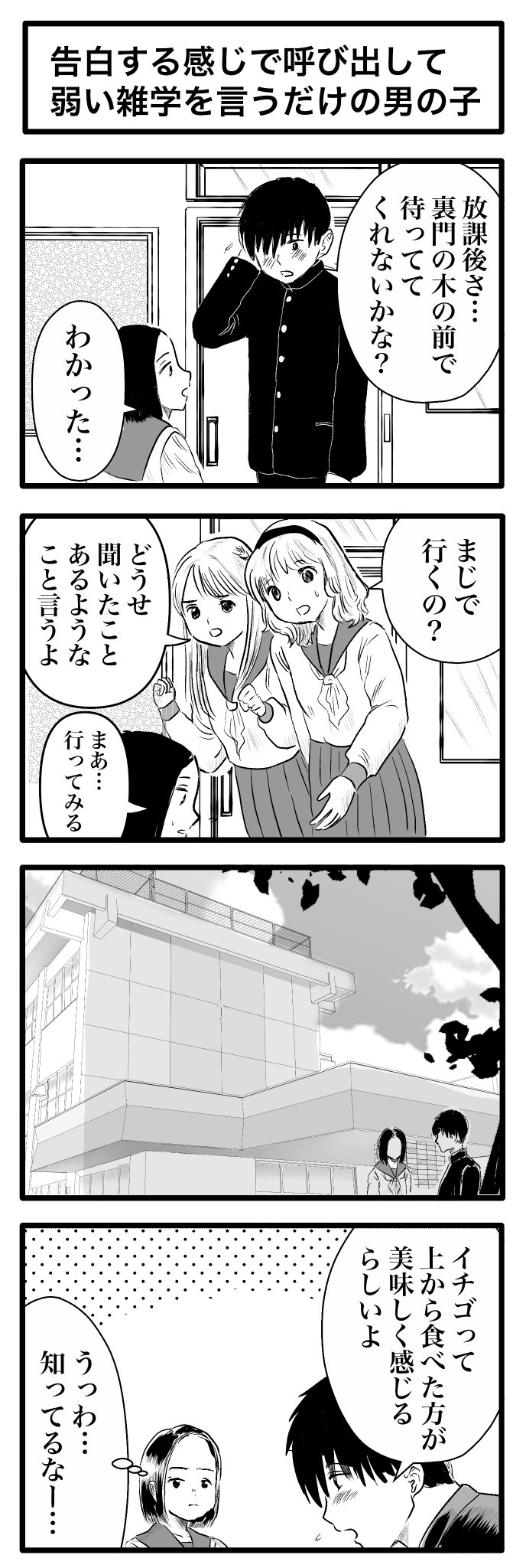 4コマ「告白する感じで呼び出して、弱い雑学を言うだけの男の子」