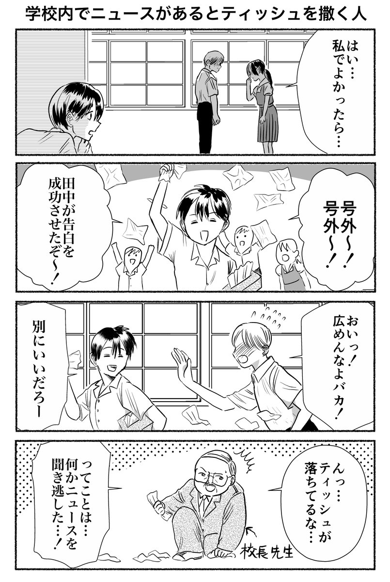 4コマ「学校内でニュースがあるとティッシュを撒く人」