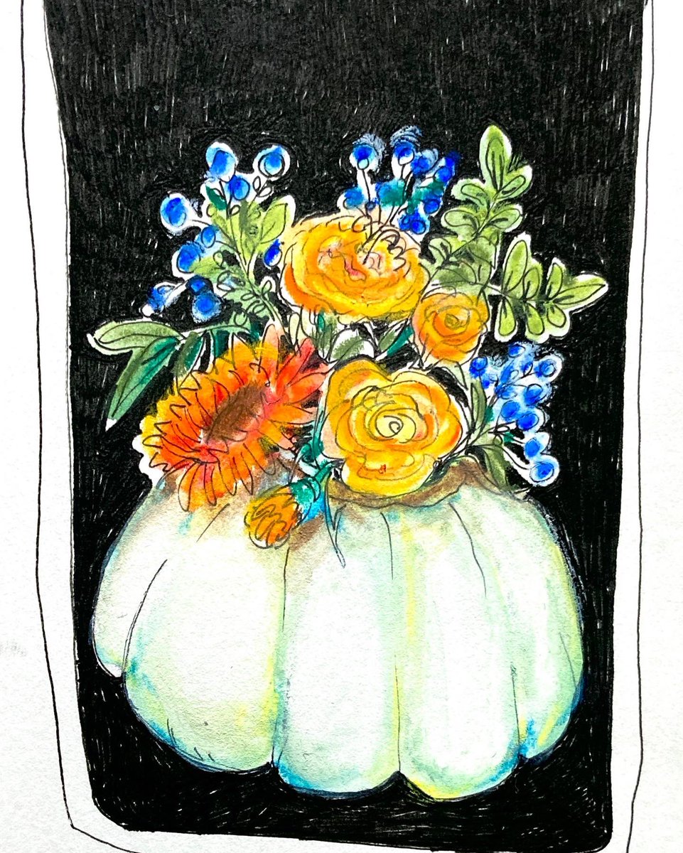 Flowers in a ghostly white pumpkin! Day 6 of #inktober2022 prompt Bouquet. I love the white pumpkin after adding color! Ohto Graphic Liner pen and colored with Neocolor II water soluble crayons. #doodlewashoctober2022 @doodlewashed #Pumpkin #flowers