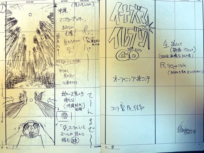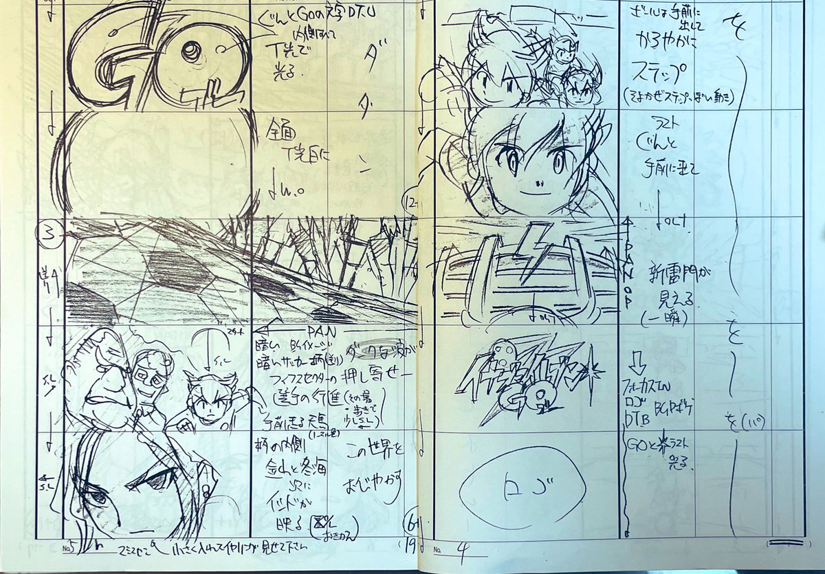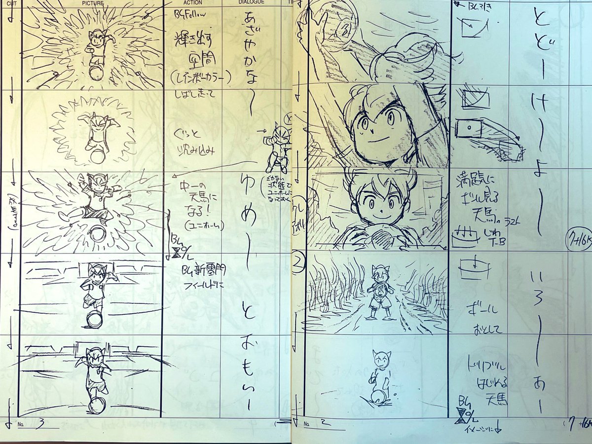 これも懐かしの絵コンテですね。 オープニングとエンディング 両方手がけてた時です。 グラフィックとアニメ絵を バランス良くが特徴です。 イナズマキャラバンを どう上手く絡ませるかを軸に アイディア捻り出しました。 それでいて王道な作品感を 出したかった。 3DCGのバス以外は全て止め絵です。 twitter.com/kouji777gan/st…