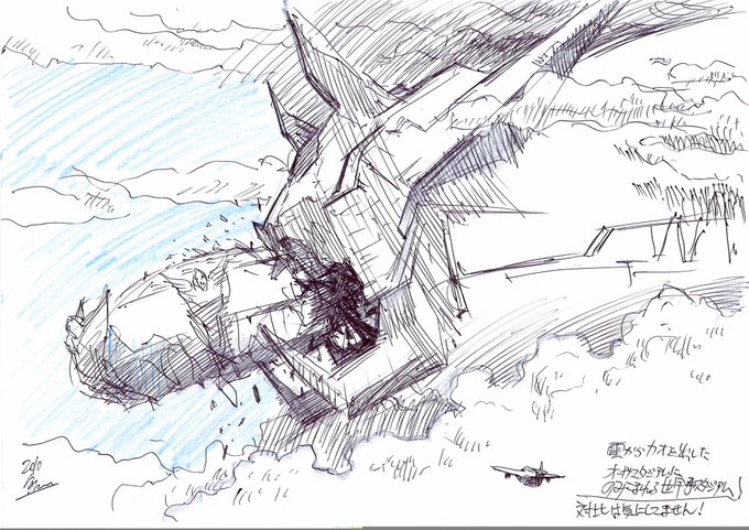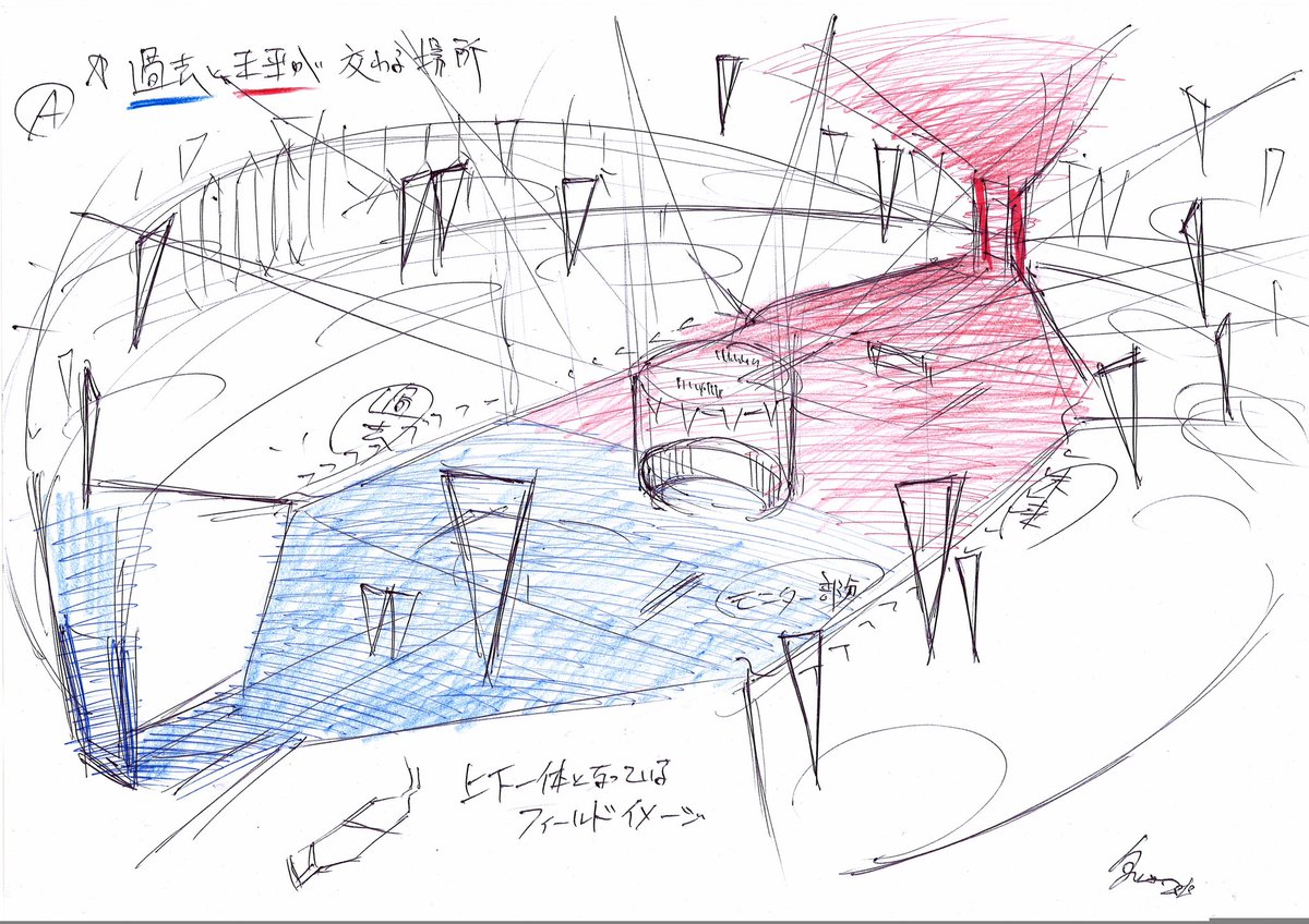 #こんなお仕事やってましたなシリーズ 『劇場版イナズマイレブン オーガ襲来』 のためにアイディアスケッチ シナリオ開発中初期に考えたアイディア 世界感を考慮しつつ こんなシュチュエーションが あると世界感が寄りクールになると 思い描いた。 後に鬼の意匠はスタジアムに 活かされる。