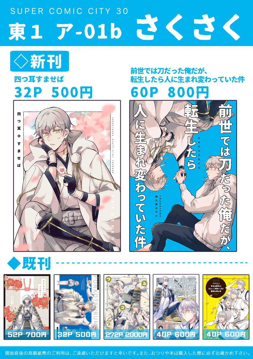 242 1636 スパコミの新刊サンプルです(1/2) 鶴丸の心の声が聞こえるようになる話 鶴丸は二振り出てきます🐣🐥 【5/3閃華】新刊サンプル | ケイ子 #pixiv pixiv.net/artworks/10743… 23/04/23 20:24