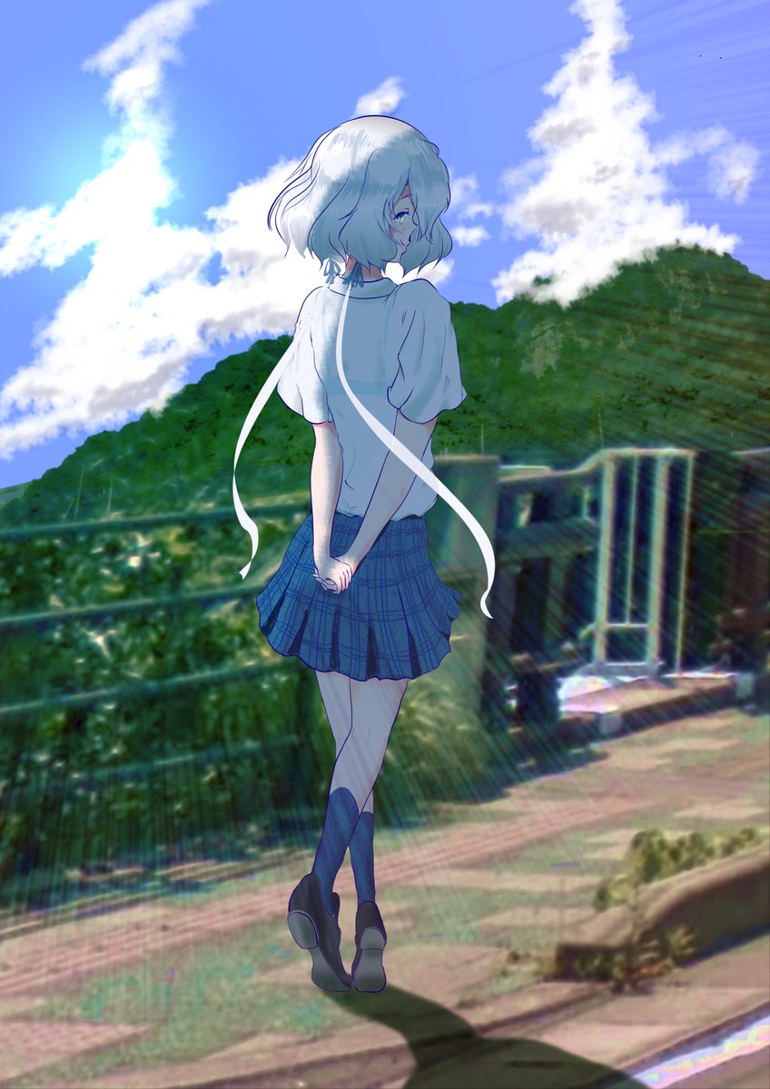 #紺野純子生誕祭2021 ということで前々から描きたかった、夏服カッターシャツの純子ちゃんと制服デートしたい人生だった絵を手っ取り早く描いてみました。背景はグーグルアースからスクショした嬉野と自分で撮った武雄の山の合成っす。