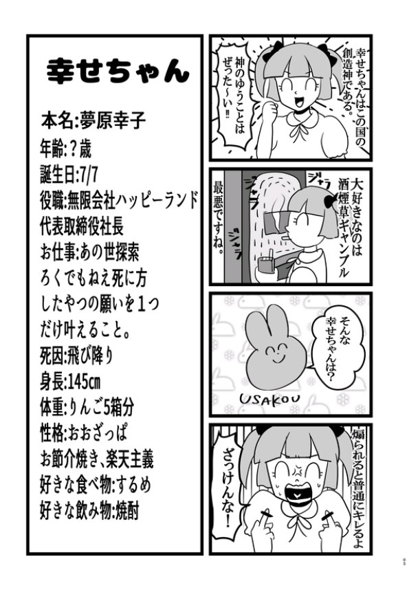 すっかり夏になったので自己紹介します!メルヘン、シュール、きらきら、ゆめかわが好きな変人漫画描きでハッピーランドの首領です。みんなに幸せちゃんを知ってもらえるようがんばります! #絵描きさんと繋がりたい #夏の創作クラスタフォロー祭り #イラスト好きな人と繋がりたい #イラスト