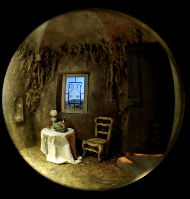 28 89 scope「GROTTA」は2007年15年も前の作品。羊の首の彫刻もランプシェードも1mmの柘榴?も象牙で作った。鏡と窓はガラス製。 17日(土曜)から! 22/09/14 18:57