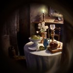 TARUHO展ご覧になった方ありがとうございます。scope「月光密造者」ですが ☆鍵穴から覗いていた事に気づきましたか? ☆床に人影が現れる事に気づきましたか? ☆露台に出る手前にガラスの扉がある事に気づきましたか? ☆露台の蒸留器のプレート(1×2mm)の文字は見えましたか?