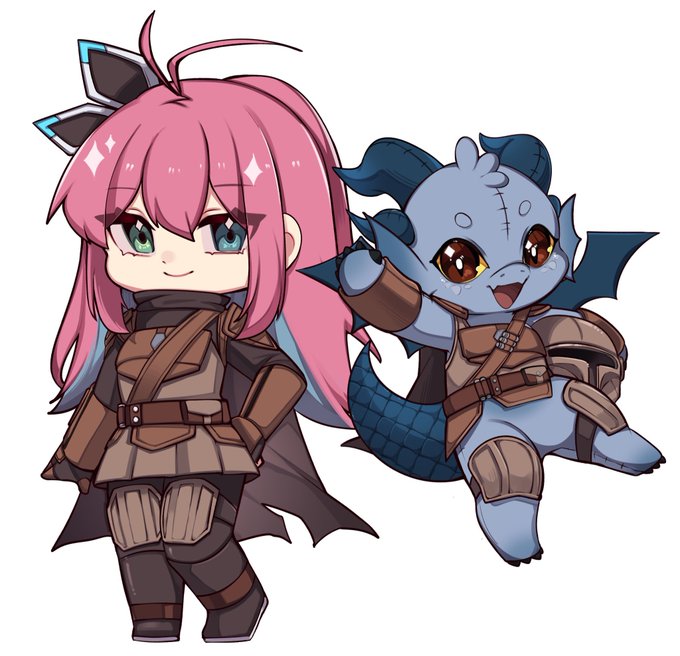 prepare for trouble and make it double! …wait. i mean. pew pew war of stars. one of the things @Hiroe_VT and i love is mandalorian armor. so now we get to be armor buddies and scoundrels together!! [art by @rayrie_] #RKGKagi #scribbledrox