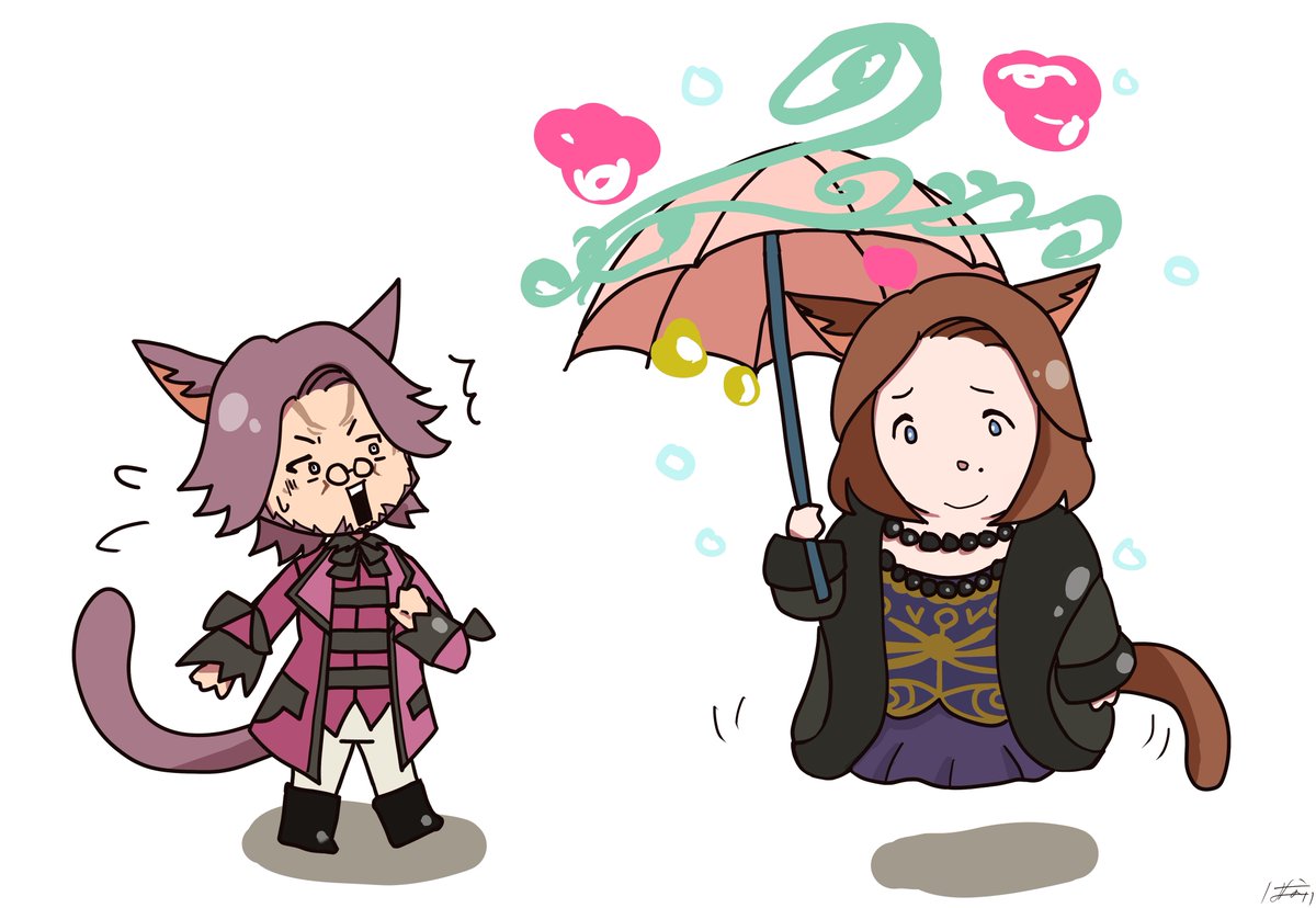チャイ・ヌズがドゥリア夫人にマジックパラソルをプレゼントした結果… ドゥリア「あら、思ってたより飛ばないのね」 チャイ「いや、あの、それはだな…」 #FF14 #FFXIV #FF14art #FF14イラスト