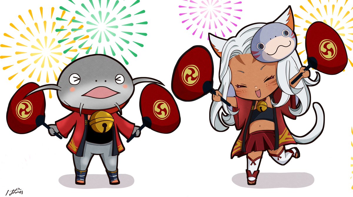 褐色ミコッテちゃんとナマズオ(中身ララちゃん)🎇🎆 #FF14 #FFXIV #FF14art #FFXIVART #miqote