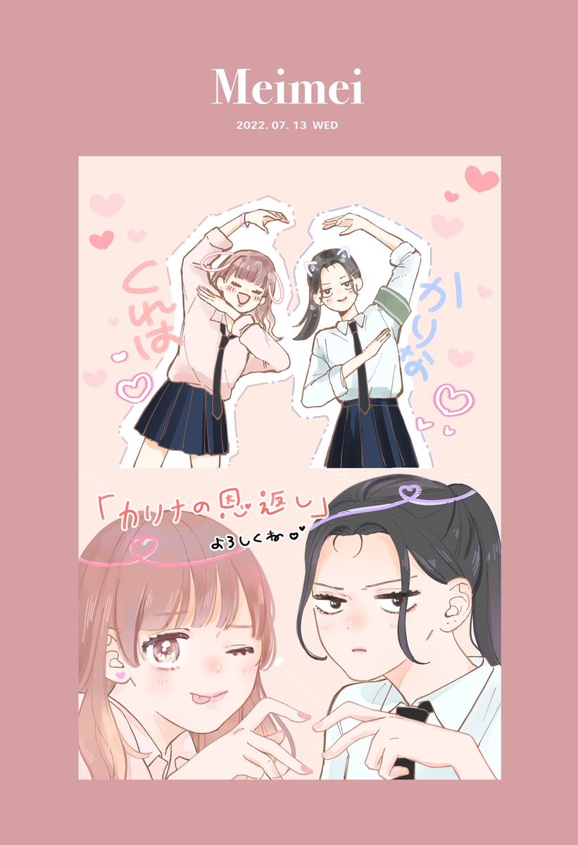 39 146 お知らせ ☁️ 別マ8月号 別マBABYにて 「カリナの恩返し」掲載させていただいております! 元ヤン カリナが恩返しのため生徒会に入って大暴れする話です💥 楽しんで頂けたら嬉しいです˘ᵕ˘ 3枚目はカリナとくれは(友)のツーショプリみたいなものを描いてみた👯♀️💜 よろしくお願いします 22/07/13 20:54