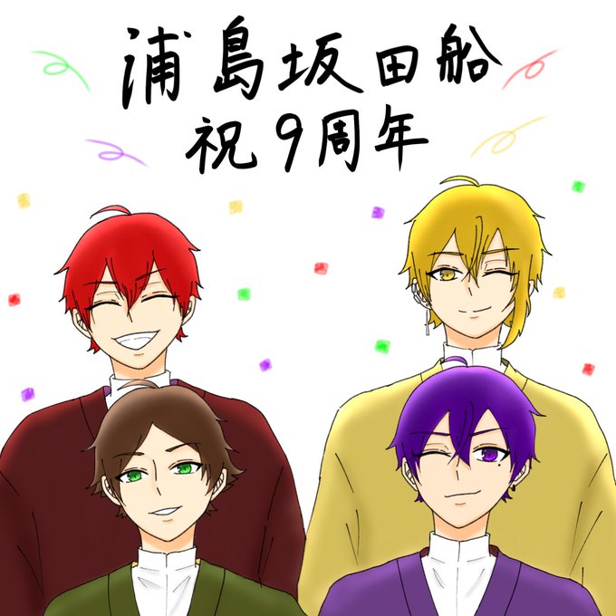 浦島坂田船結成9周年おめでとうございます💚💜❤️💛 夏ツやハロパ等、今は大事な時期だとは思いますがお体に気をつけて来年の10周年に向けていい航海を続けていけますように𓂃𓊝𓄹𓄺 #浦島坂田船結成9周年 #浦島坂田船9周年 #うらたぬ王国の美術館 #しまーと #坂田です #センラの絵ぇやん