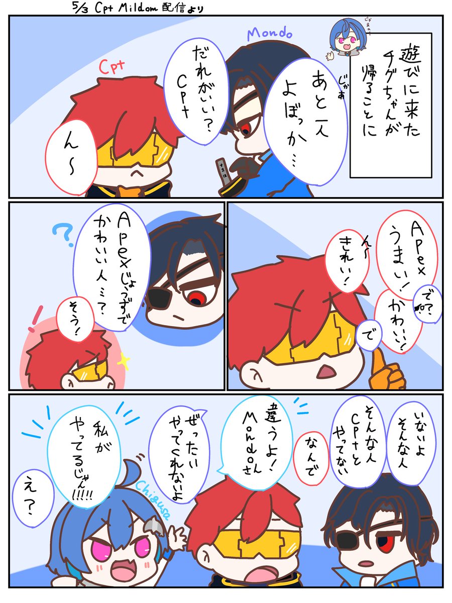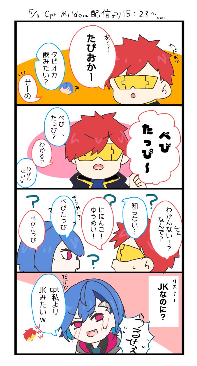 べびたっぴがわからないチグちゃんとやたらかわいいCpt (漫画描くの久しぶりすぎて色々細かいところは目を瞑って欲しい) ※一部セリフ改変あり&流れが実際とはちょっと違う #ニシゾノート #Cpt_art