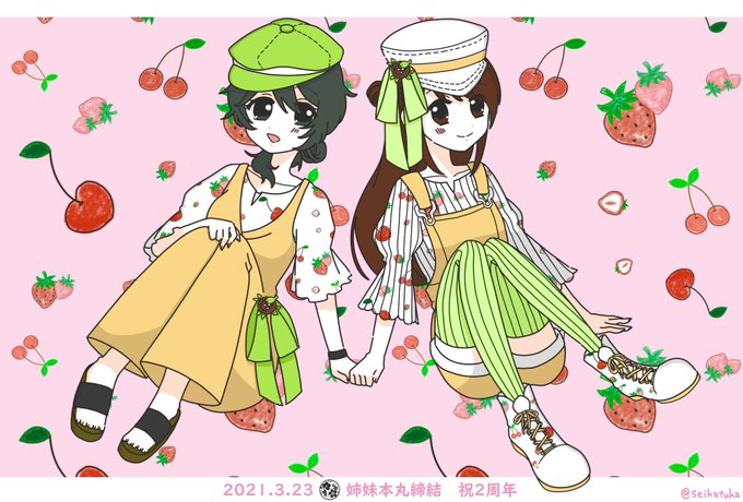 7 14 たかげ@takage0ちゃん宅・厚さにのヨスガちゃんと うちの女審神者・初月の! 姉妹本丸締結2周年お祝い絵です~🍓 (2人のシャツ、靴、背景の柄はたかげちゃんが考案して制作くれました…めちゃくちゃ可愛いの…ありがとうございました…☺) 21/05/11 20:02