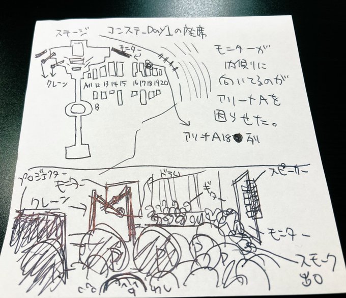 #cg_コンステ_day1 こちらが今日のアリーナA18ブロックの視点メモ 目の前のモニタは角度が平行四辺形で細いうえスピーカーで半分隠れている 正面左のモニターはクレーンカメラ2台の柱でほぼ見えないうえクロスまでする ステージ最上のバンドのみ見える パイプ椅子から真横を向くので人が扇状