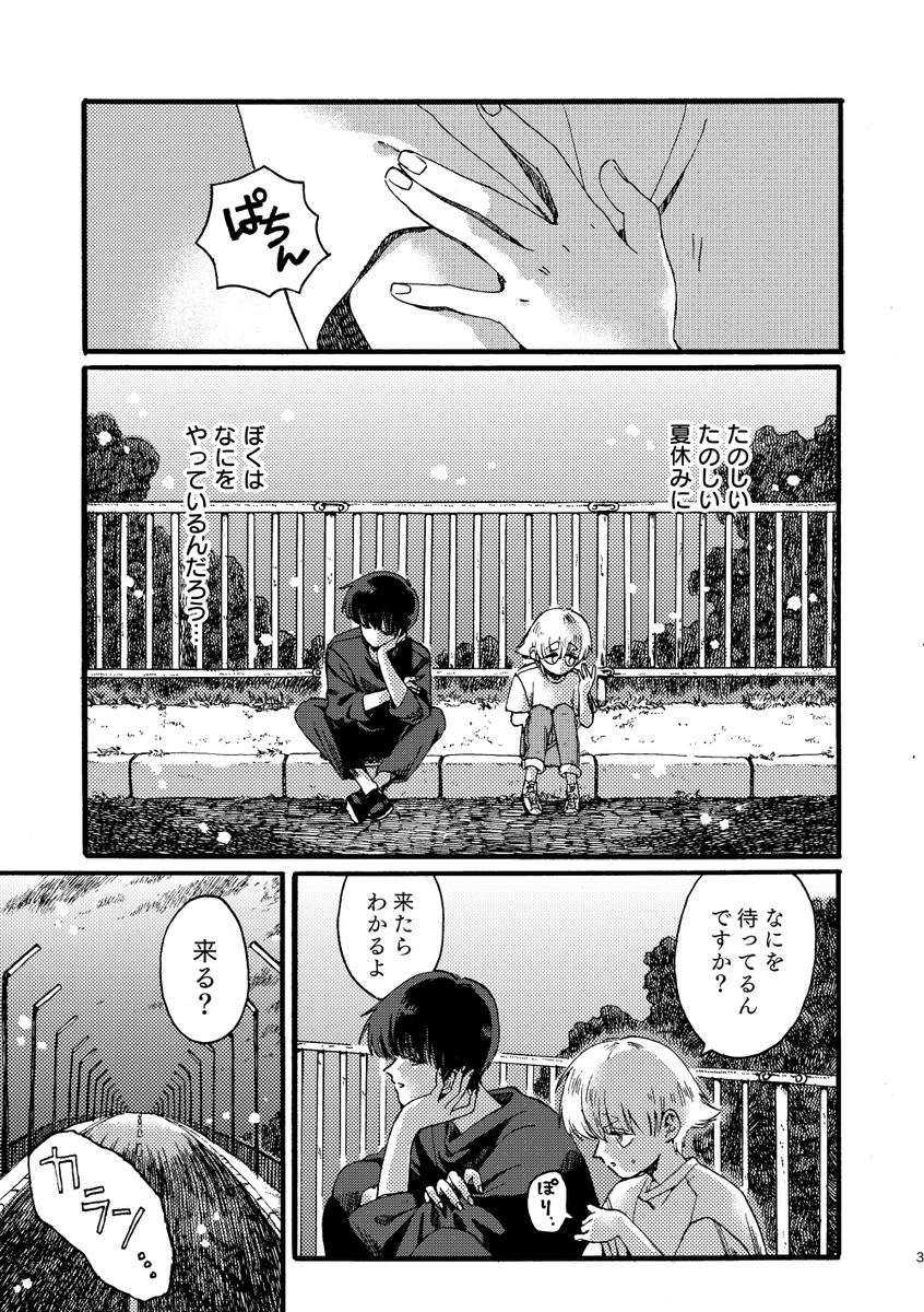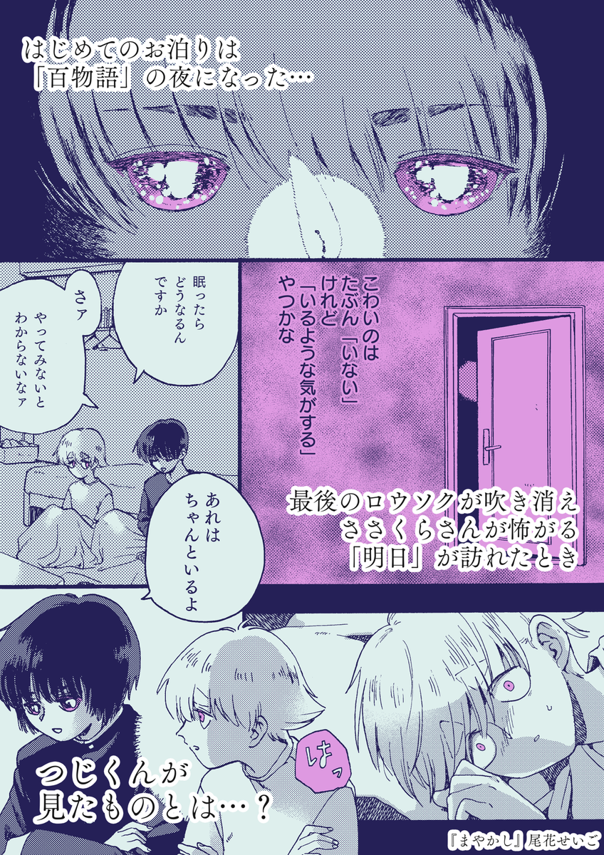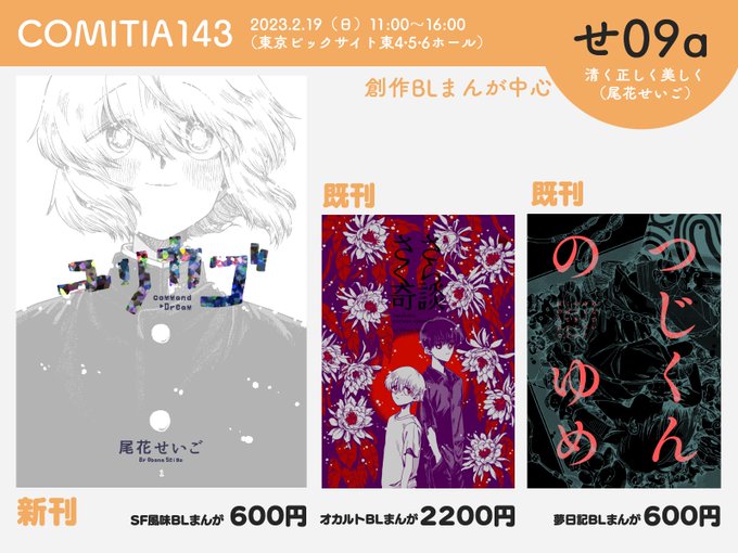 2/25~26 #創作BLオンリー関係性自論2 (@kankeiseijiron)に参加します! pictsquare.net/hoaynhl3lpohss… 【全年齢Bエリア う3】清く正しく美しく ビミョウな距離感の少年とお兄さんのまんが多め。 オカルティックなお話も多め。 最新刊は夢を見せる機械と青年たちのお話です。 よろしくお願いします!