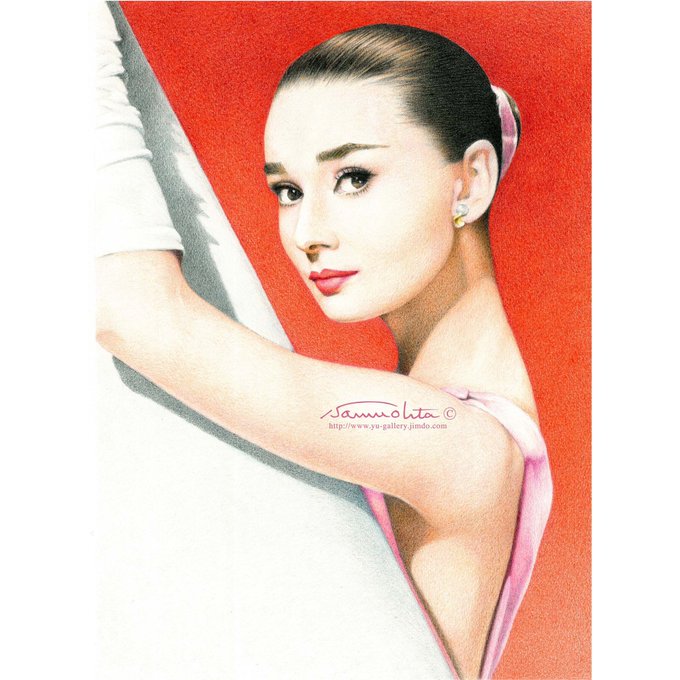 新作のオードリー色鉛筆画完成!この作品は、今秋10月に開催予定のオードリー展のDMの図柄にする予定です。2枚目のオードリーは、2015年に描いたものえお再々加筆したものです。 #オードリーヘプバーン #色鉛筆画