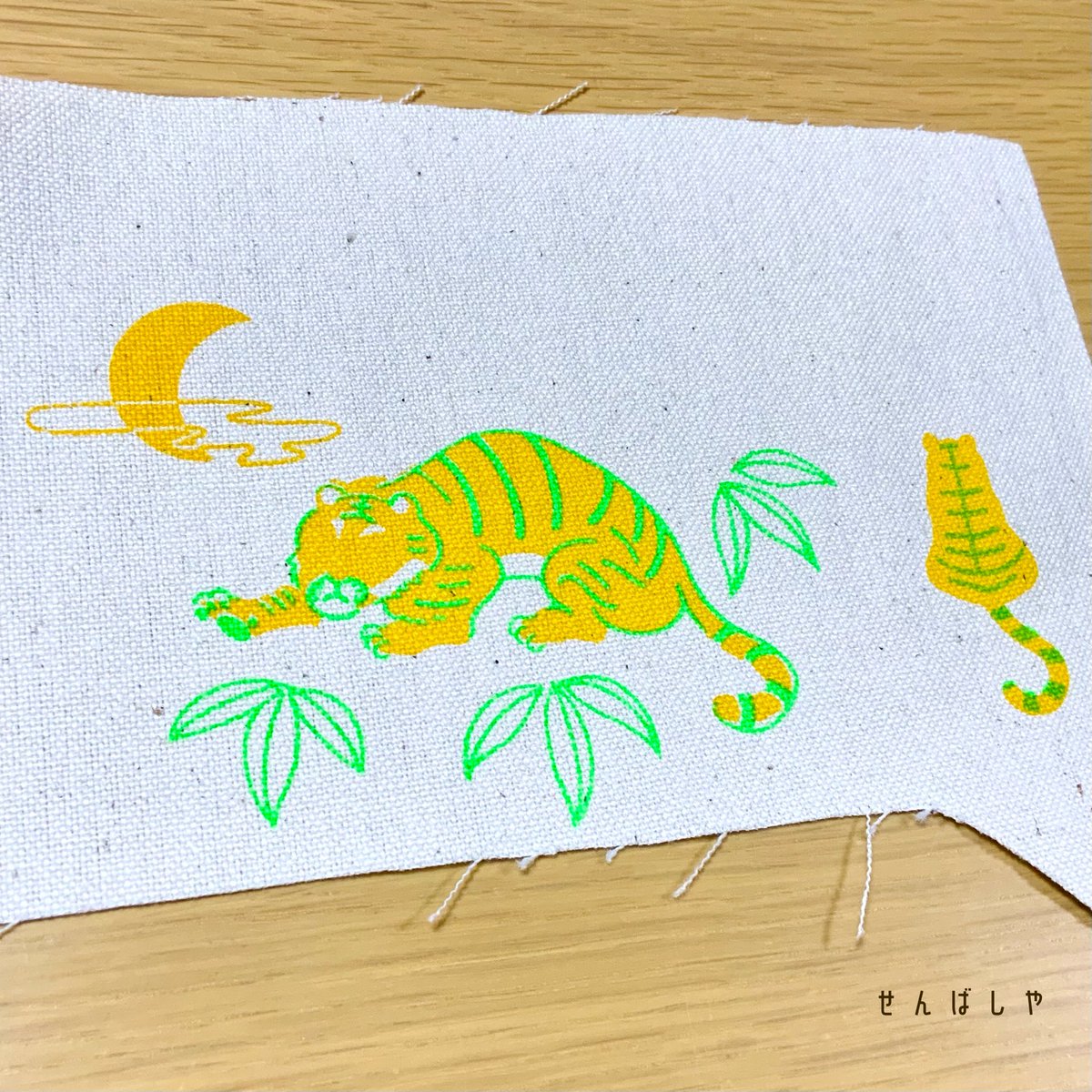 試し刷りがメッチャ可愛い🐯 家にあったスカジャンを参考に ポップなトラになりました😆 ブックカバーと手帳カバー作ります🙌 #イラスト #シルクスクリーン