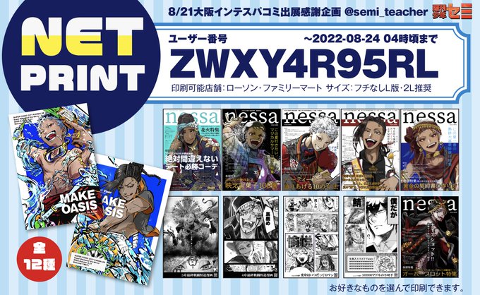 29 59 【8/21大阪スパコミ参戦記念企画】 ネットプリントのおしらせ 全12種の絵柄(nessaと名場面集と水着) 店 舗:ローソン・ファミリーマート サイズ:2L版を推奨 値 段:店舗・サイズに準拠 8/24 04:00まで ポストカードサイズにはできなかったので、会場のものと若干幅は違います!お許しを! 22/08/21 06:30