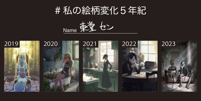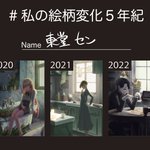 #私の絵柄変化5年紀 テンプレお借りしました! 今の方向性を定めたのがちょうど5年前くらいだった… しかし似たような絵を集めてみたけど似たような絵を描きすぎではないか