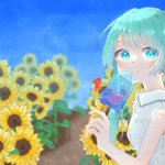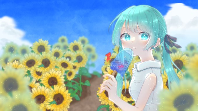 夏!青空!ひまわり!金魚! そして初音ミク!! キラキラで可愛いミクちゃん描けた🤍✨ #ボカロ #初音ミク #ボカロPさんと繋がりたい ↓こちらも是非お使いください🥳 #ボカウォッチ楽曲祭夏イラスト