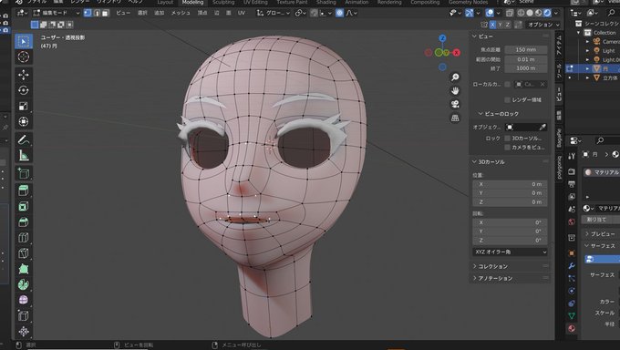 【 27日目 】その2 顔の基本造形大体できた! 目と耳~ 耳難しそうですね🙃 髪が難関なんですけども・・ ちょっとずつ進もう サーフェスにSSS入れてみたよ テクスチャないからゴムの人形みたい🤣 #blender #100日チャレンジ #blender初心者 #b3d