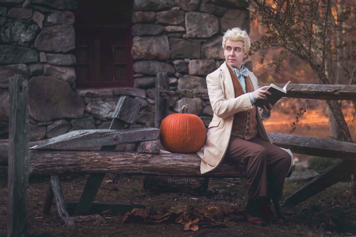 An angel and his pumpkin friend! I really love the composition of this photo (by @silhouettecos ). @neilhimself @michaelsheen #GoodOmens #goodomenscosplay #aziraphale #aziraphalecosplay #cosplay