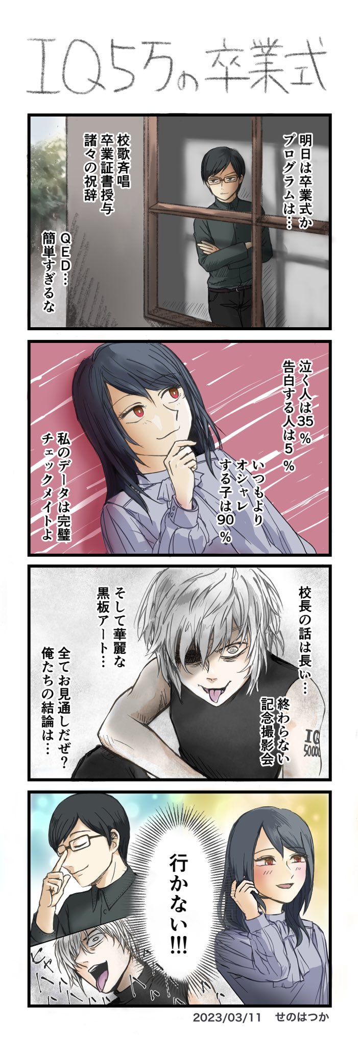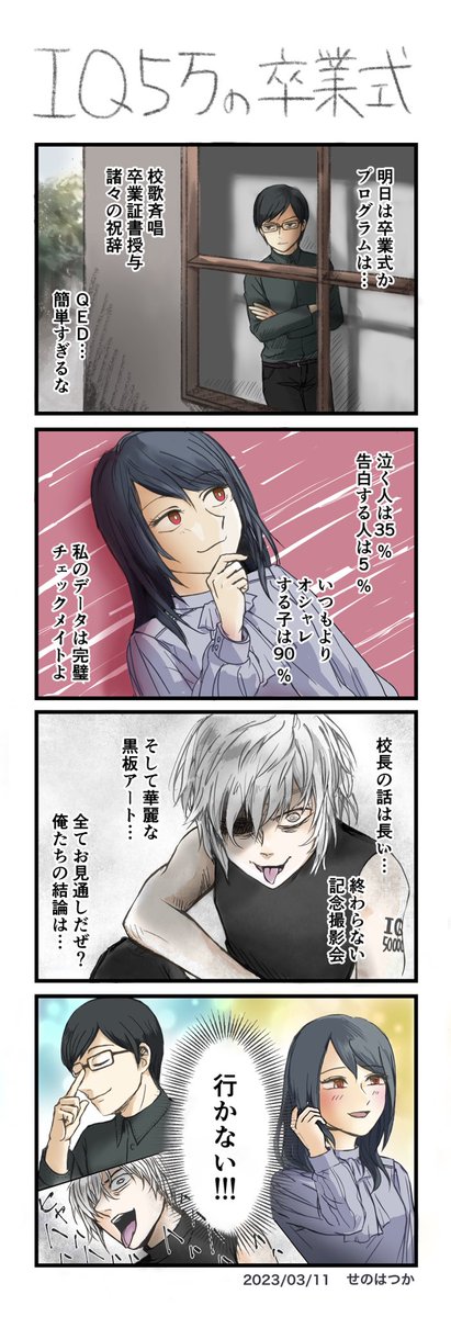 19 112 #ヨンバト お題:卒業 IQ5万の卒業式 効率最重視です #4コマ #4コマ漫画 #4コマR #漫画が読めるハッシュタグ 23/03/11 17:05
