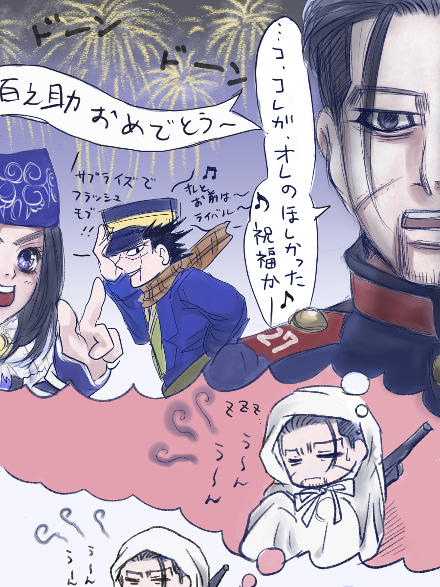 只今潜伏中で一人うなされてる悪夢無限ループ、、花火小さっ!遅刻のやっぱり2,5ドロ以上かかった、、ワンドロへの道きびし、、🤢🤢 #ゴールデンカムイ版深夜の真剣お絵描き60分一本勝負 【お題】花火、、