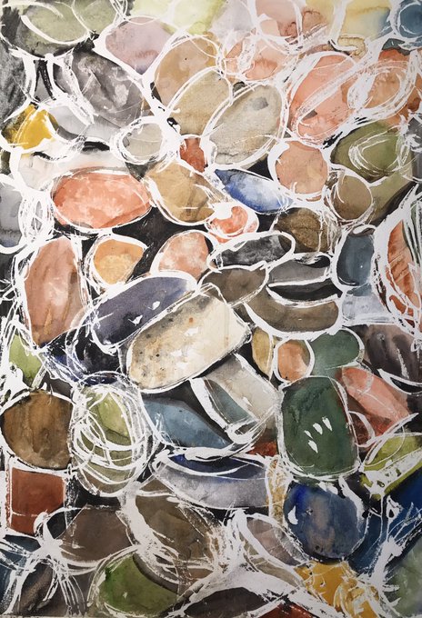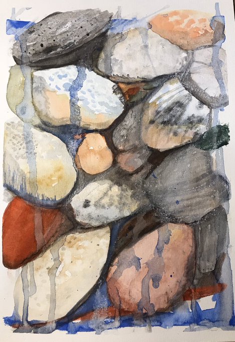 “Stoned, he was stoned.” 16/03/2023. #watercolorpainting #aquarelle #pebbles #galets #beach #plage #clmooc