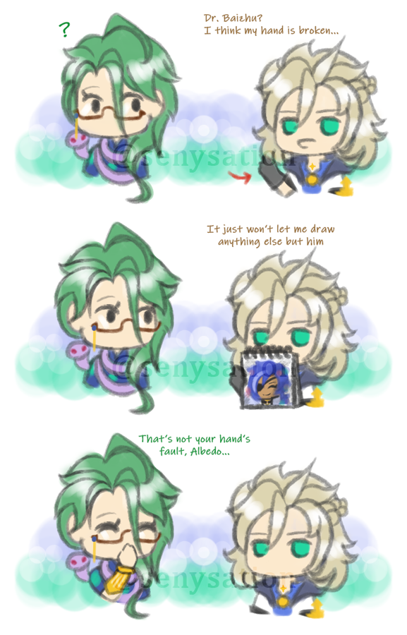 Finished my little #Kaebedo comic (feat. Baizhu) 🥰 Love these boys 💛💙💚 #Albedo #Kaeya #Baizhu #GenshinImpact #GenshinImpactFanart
