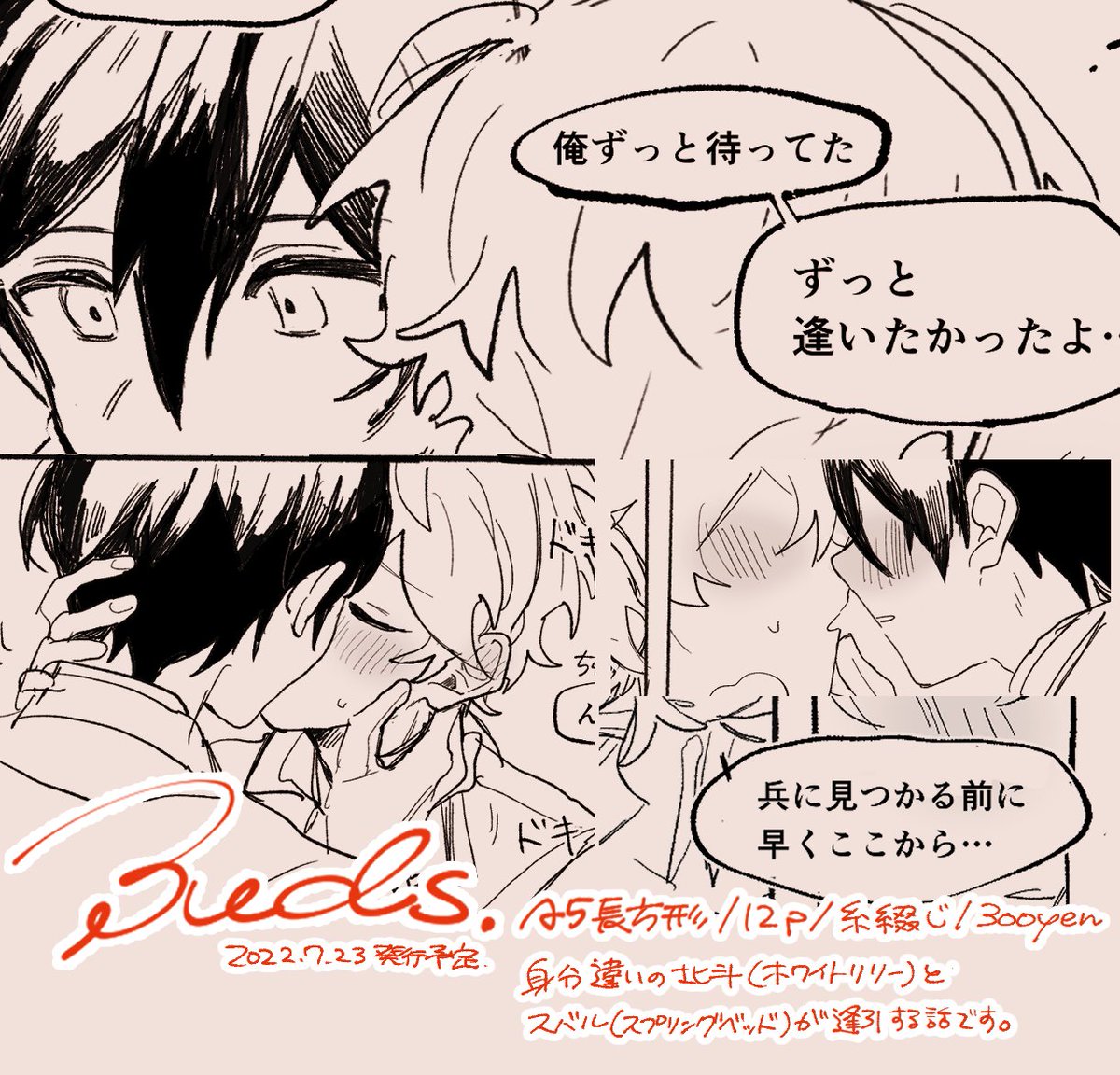 52 178 【7/23星に願いを.2022-day1-北斗七星キラリ】 『Buds.』 A5長方形/12p/全年齢 身分違いの北スバ(ホワイトリリー × スプリングベッド )が逢引するお話です。 東2ホール ニ24b『seputopo』にて頒布予定です、よろしくお願いします〜!🌹🌷 22/07/16 21:46