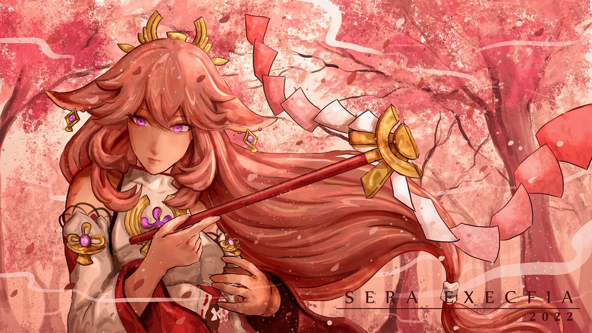 Draw some #yaemiko #GenshinImpact art for practice Spend much on the character because im not used to do color first, then lineart, then just speedrun the background for 30 minutes '-') #genshinimpactfanart #ArtistOnTwitter