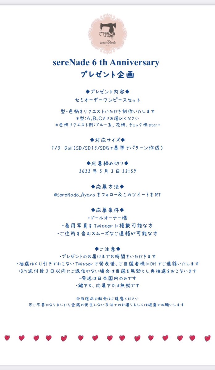 261 241 【6周年プレゼント企画🎁】 おかげさまでsereNadeは5月で6周年を迎えました 感謝を込めて2名様にセミオーダーワンピースを制作&プレゼントいたします 画像1枚目にお目通しの上ご応募くださいませ 〆切:5月3日(火・祝) #sereNadeOutfit 22/05/01 14:01