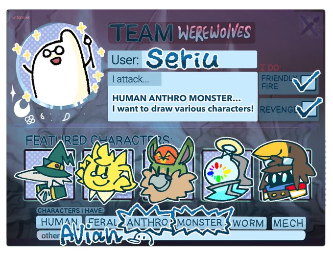 🎨Art Fight My page!⚔️ artfight.net/~seriu 🌕I'm Team Werewolves🐺 💪I will post the link to the attack in the reply to this tweet! #artfight #Artfight2023