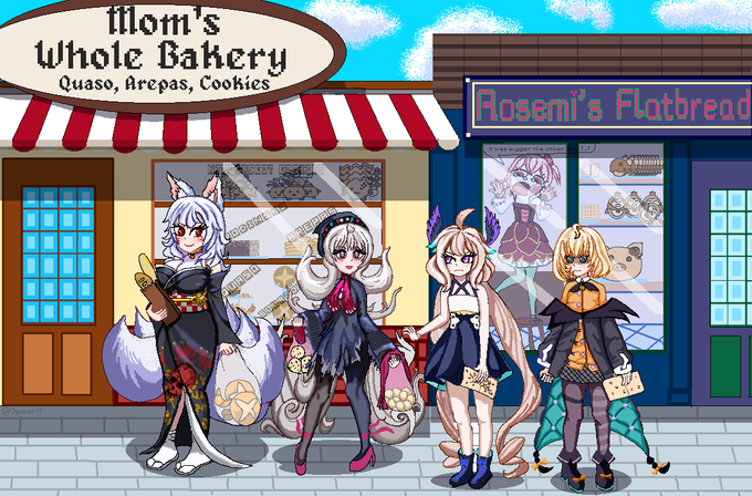 Ethyria in Pixel art, also with a Rosemi cameo, Nina carries the whole bakery #Ethyria #DrawKosaka #Reimural #DrawMillie #Palouette #GalleryOfRoses #pixelart