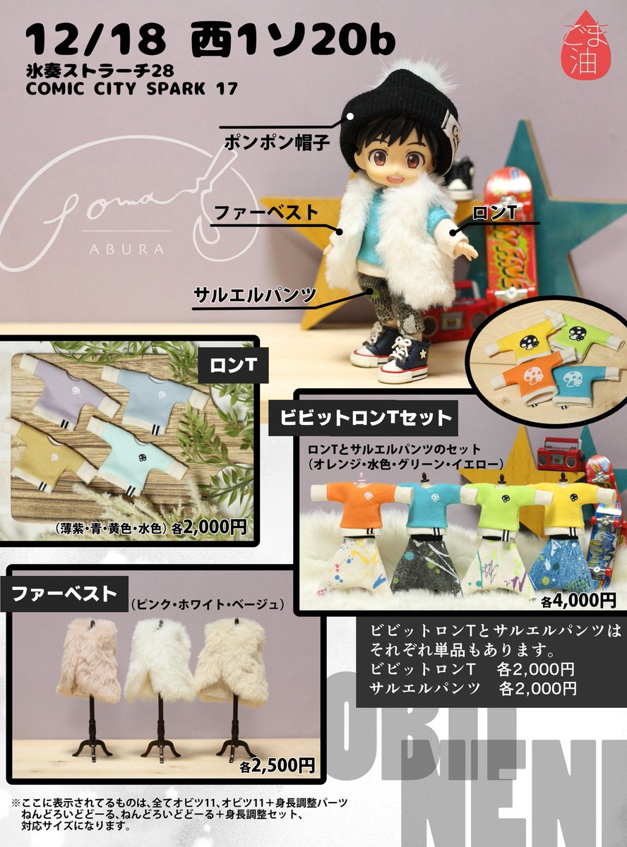 【お品書き】 2022/12/18 【COMIC CITY SPARK 17】 氷奏ストラースチ 西1ソ20b 今回は着回しローテを割と意識したお洋服になってます。 オビツ11、ねんどろいどどーるサイズです。 よろしくお願いします😊🙏 #オビツ11 #ねんどろいどどーる