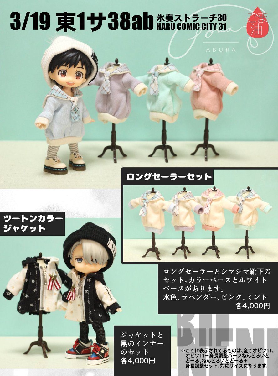 【春コミお品書き】 3/19 氷奏30 『東1 サ38ab』 お品書きになります。 当日はよろしくお願いします。 Jickさん(@AnfangShop )とのコラボ、委託もあります。 #オビツ11 #ねんどろいどどーる
