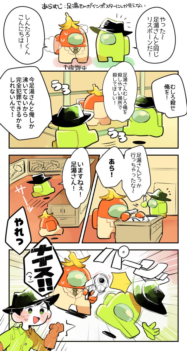 7連続インポスター後の足湯さんに協力姿勢見せ始めるしんたろさん #絵湯 #狂人たろアート