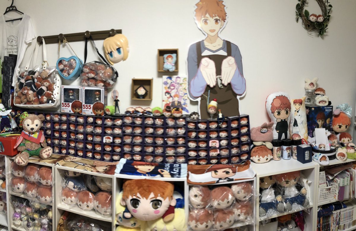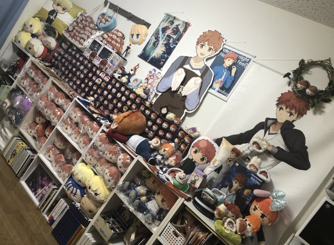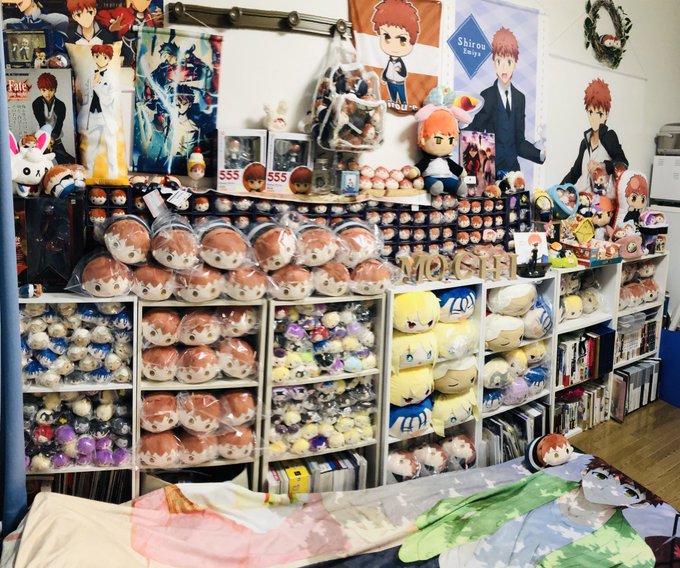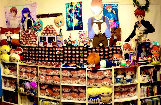 衛宮士郎に狂って、Fateグッズ10年くらい集めてるとこうなる。 3段目は全部型月雑誌と小説とゲーム、グッズ #もちもちマスコット