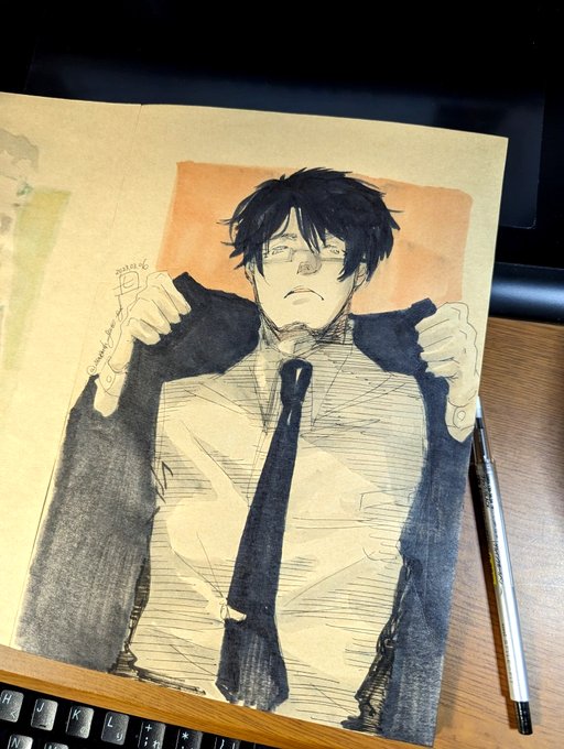 #スーツ版深夜の真剣創作60分一本勝負 2023.06.26リアタイ参加です! 本日はAYAさんのお写真お借りしました✨いつもよりずっと線を少なく描いてみるチャレンジをしました。このお写真…椅子と人物と机の向きと…難しい!楽しい!リベンジしたーい!