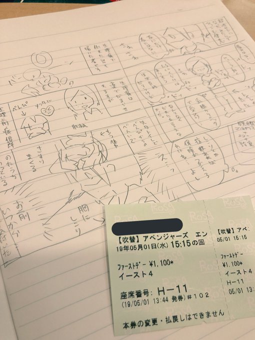 0 10 アベンジャーズ決めてくる!! 待ち時間のファミレスで久々に描いてみた。 この前胸のしこりに気づいて受診した話を書くヨ〜〜〜。 19/05/01 14:50