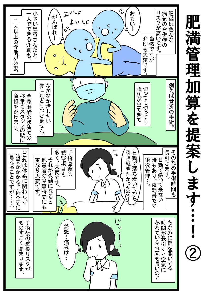 2133 2295 肥満管理加算を提案したい話。 仮に加算されたらちゃんと壊れたものに当ててほしい…職員の身体も含めて……。ちょっと攻めた話だなぁと自分でも思うので、批判もありそうですが事実ばかりなので…。 19/01/06 20:20
