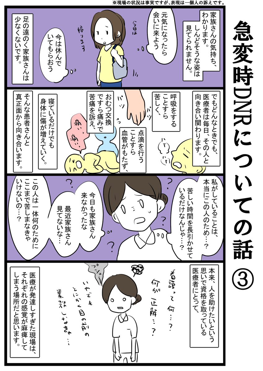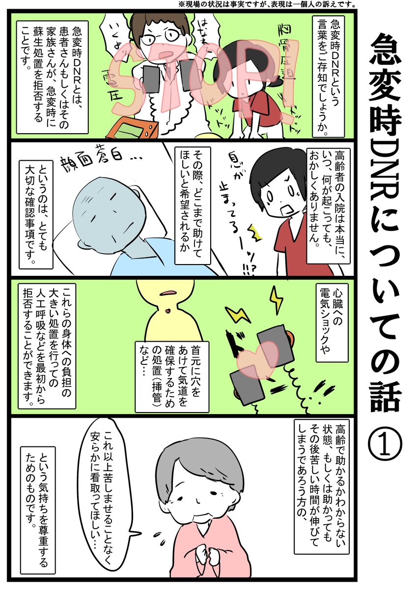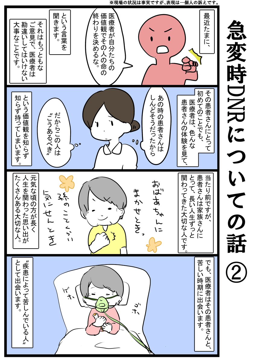 急変時DNRについての話。 アンケートとったら1位だったので描いてみたんですが、また難しい話を描いたのでちゃんとまとまってなかったらすみません…。