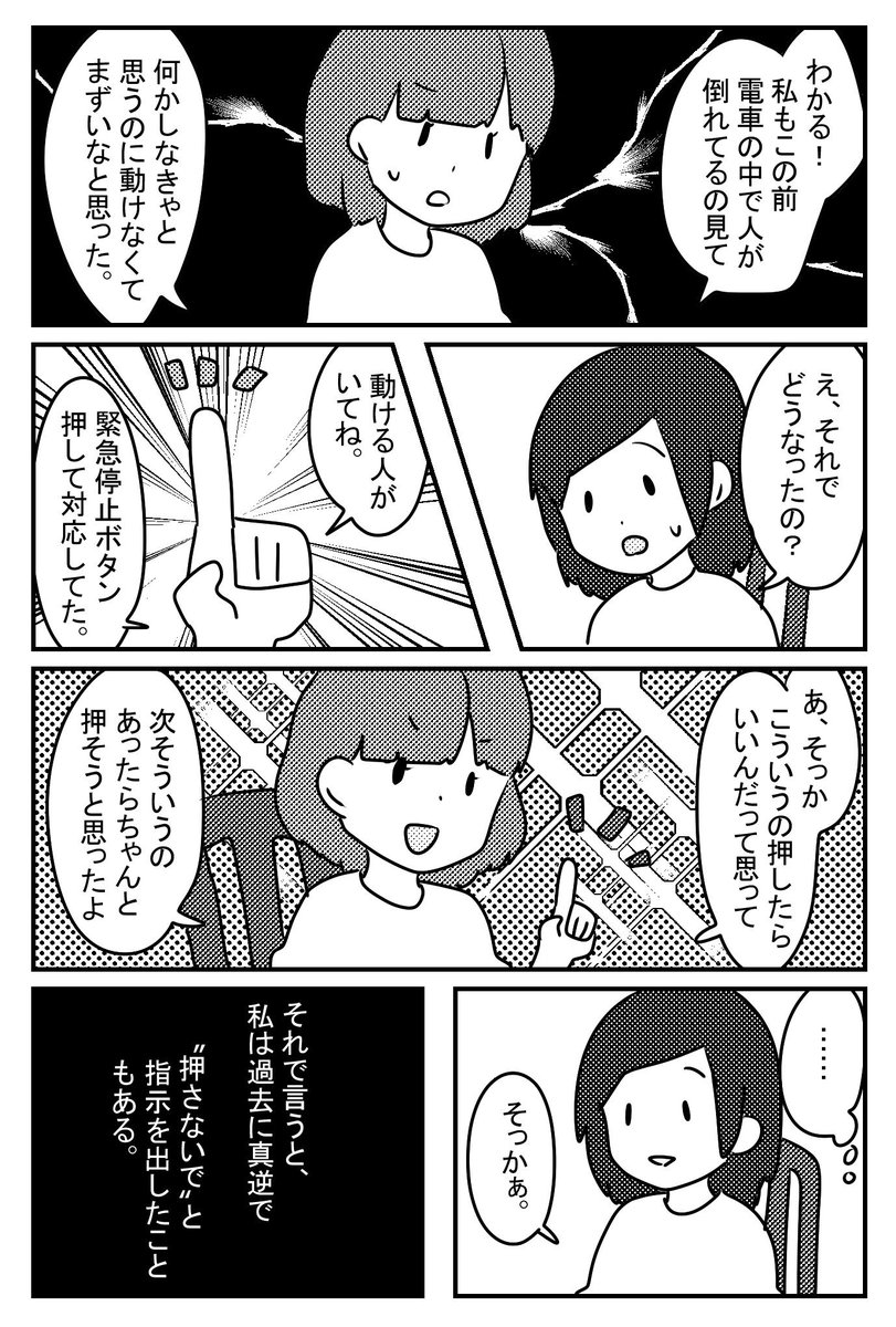 724 1390 【駅で人が倒れてた話2/3】 次の3Pで話は終わりで最後1Pでちょっとした解説入れようと思ってます。漫画に対してのリプライは漫画が終わるまで重複にもなりかねないからお返ししません。あと全部個人の考えなので悪しからず。 19/09/18 18:57