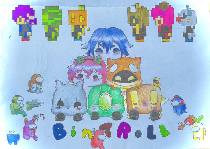 久々に描けた! 3周年おめでとうございます! 大好きです💜💚💛🤎💗🖤 #bintroll三周年記念 #bintrollFA