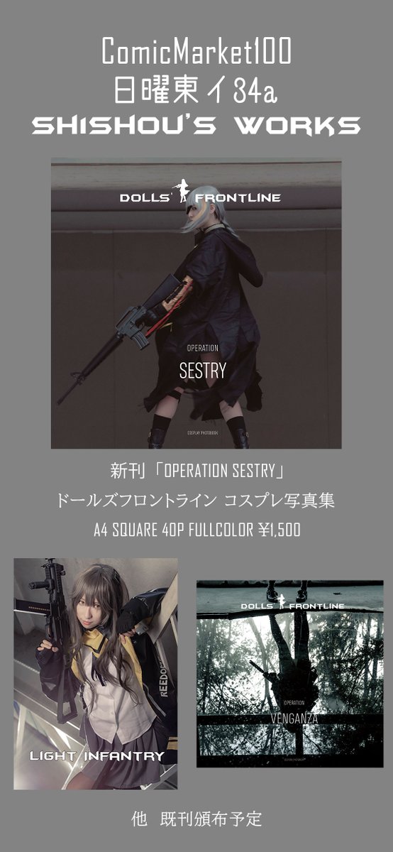 【告知】 C100 2日目 東イ34a [sh1sh0u's works] ドールズフロントラインの写真集を頒布します。 今回はコスプレxシネマxマンガな新しい試みに挑戦しました。 コロナ禍で大変な時期ではありますが、皆様にお会いできるのを楽しみにしています。 宜しくお願いしますm(_ _)m #C100 #ドルフロ #少女前線