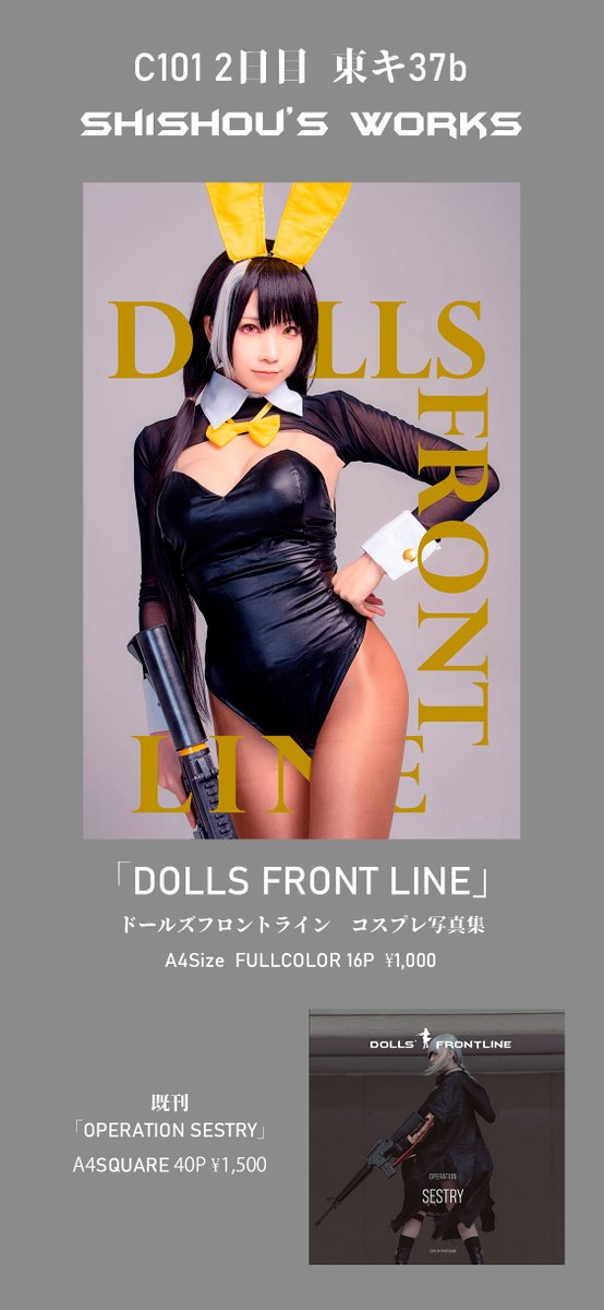 44 75 【告知】 C100 2日目 東イ34a [sh1sh0u's works] ドールズフロントラインの写真集を頒布します。 今回はコスプレxシネマxマンガな新しい試みに挑戦しました。 コロナ禍で大変な時期ではありますが、皆様にお会いできるのを楽しみにしています。 宜しくお願いしますm(_ _)m #C100 #ドルフロ #少女前線 22/08/07 19:49