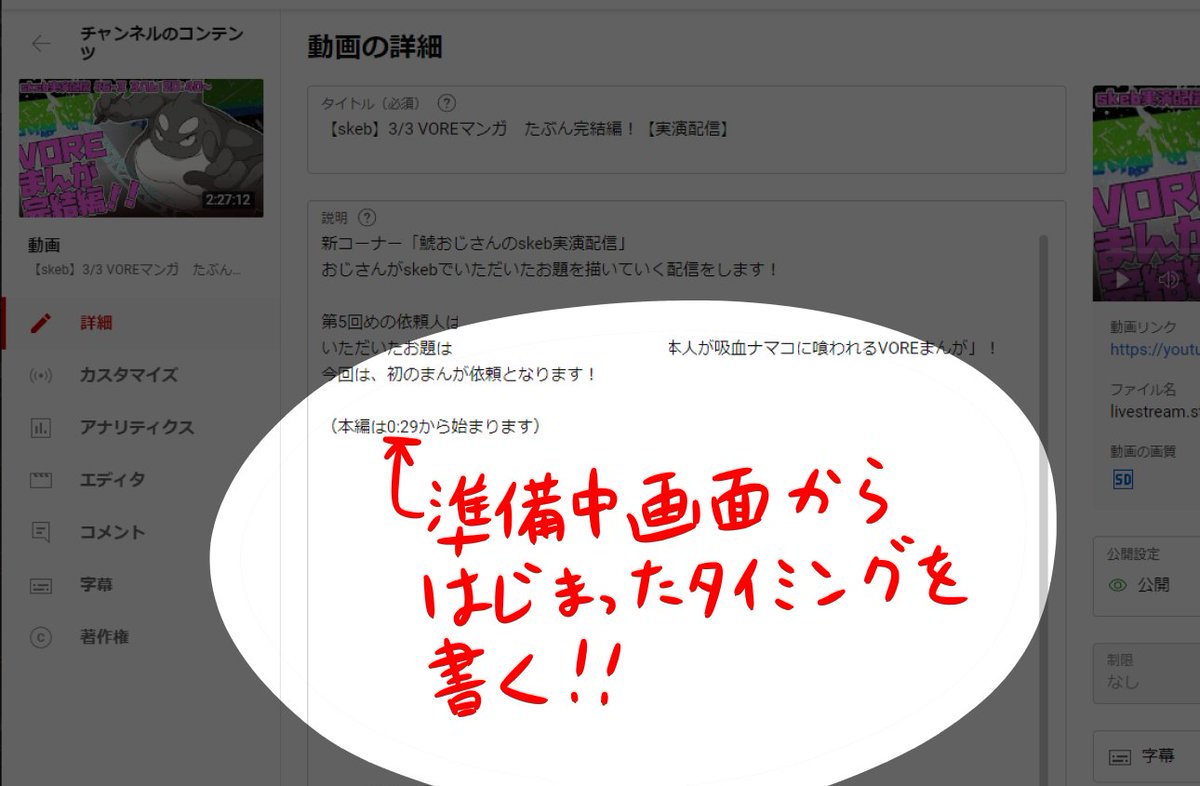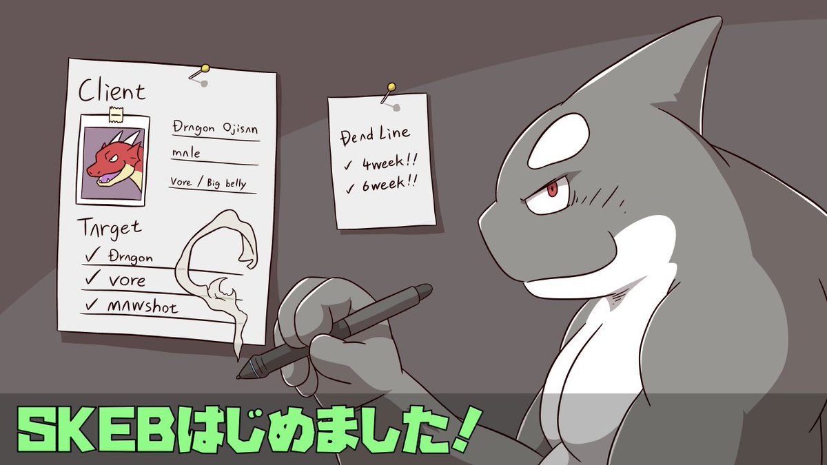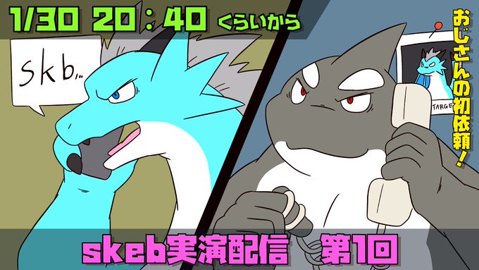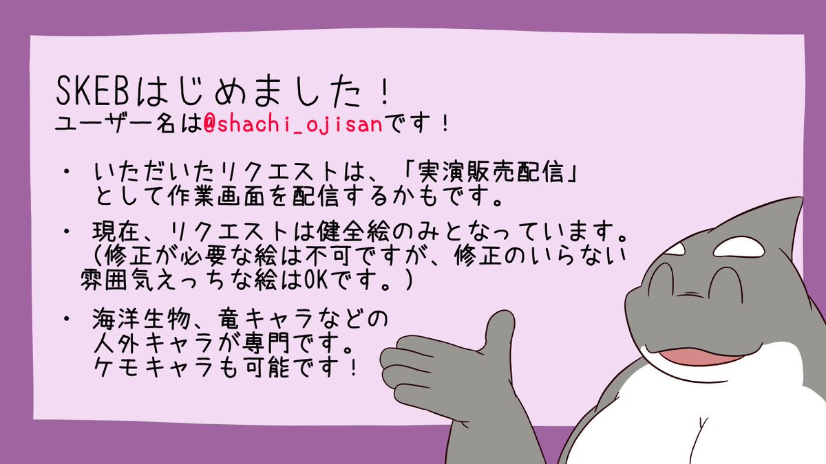 そして、もうひとつ告知ッ! 先日の配信より、おじさんskebをはじめました! URLはこちら!→ skeb.jp/@shachi_ojisan 投げていただいたコミッションは、実演販売みたく作業配信も行う予定です!詳細はリプにて……♡