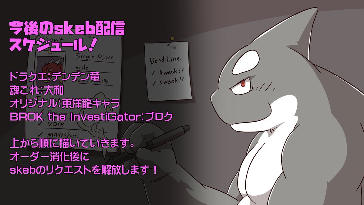 今後のskeb配信のスケジュールはこちら! 現状、いただいている未消化オーダーは4件!気になるキャラがいましたら、ぜひ配信を見に来てくださいな♡ 次回はドラクエのデンデン竜が、スク水やバニー服などを着る絵を描きますヨ! 配信チャンネルはこちら!よろしくです!↓ youtube.com/c/shachiojisan