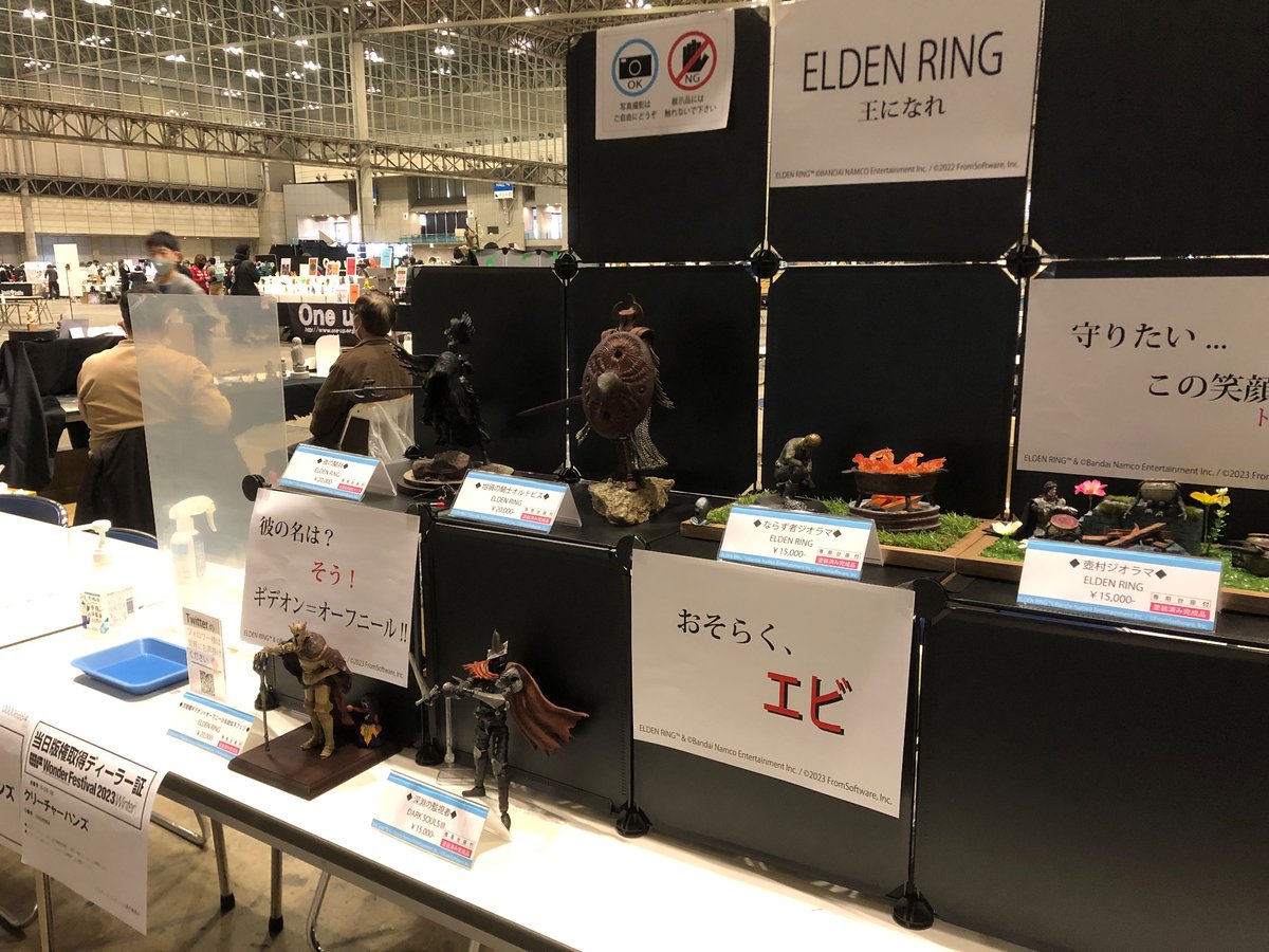 ワンフェス◆お品書き 塗装済完成品 ・百智卿ギデオン&幼女ネフェリ:5個:¥20,000 ・坩堝の騎士オルドビス:5個:¥20,000 ・深淵の監視者:5個:¥15,000(再販 ・壺村ジオラマ:10個:¥15,000 ・ならず者ジオラマ:10個:¥15,000 未塗装未組立キット ・夜の騎兵:5個:¥20,000 #wf2023w